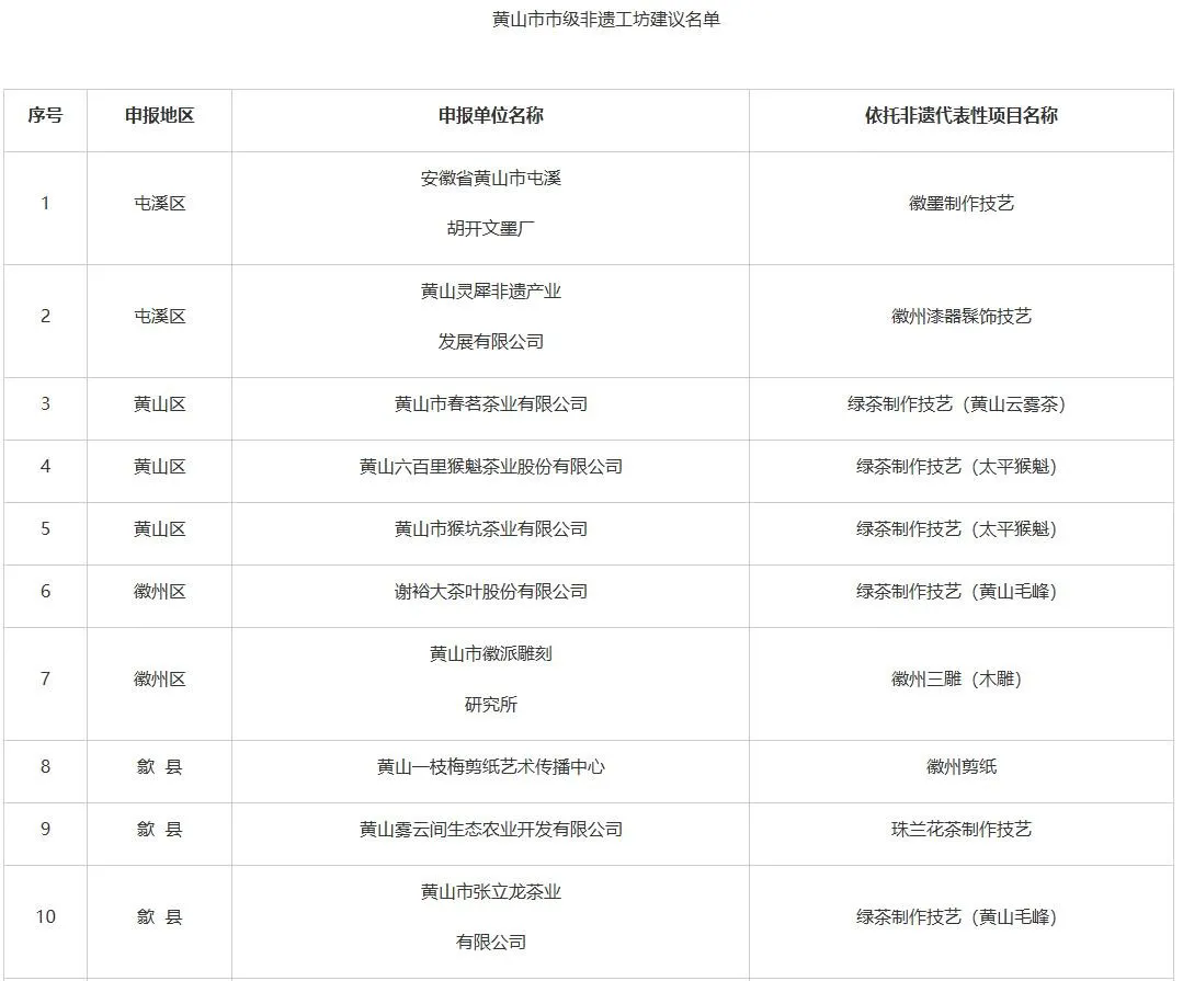 根據(jù)《安徽省文化和旅游廳安徽省人力資源和社會保障廳安徽省農(nóng)業(yè)農(nóng)村廳關(guān)于印發(fā)<安徽省非遺工坊管理辦法>的通知》要求,市文化和旅游局、市人力資源和社會保障局、市農(nóng)業(yè)農(nóng)村局聯(lián)合組織開展了市級非遺工坊認(rèn)定工作。經(jīng)申報(bào)主體自愿申請、各區(qū)縣初審?fù)扑]、市級評審復(fù)核,形成市級非遺工坊建議名單,共19家,具體名單如下所示: